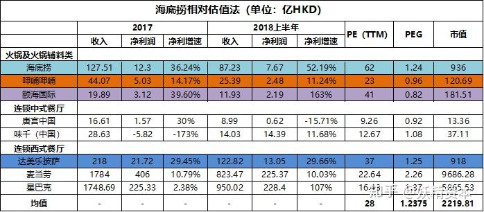 1、 同業比較:呷哺呷哺是除海底撈外唯一的火鍋上市公司,且上市多年,是最合適的同業比較公司。在18上半年,海底撈的收入和利潤規模均為呷哺的3倍左右,市值是呷哺的7.7倍,兩個數值不匹配的原因在于海底撈的業績增速遠超于呷哺,達到4.64倍。在之前我曾分析過呷哺,該公司目前已陷入增長乏力的困境,而海底撈在上市前后,特別是募資后的頭兩年,會處于一個高速擴張期,在未來的擴張空間也還很大。這是造成兩者估值差異倍數較大的主要原因。另外,海底撈的品牌價值極高,號稱餐飲業內的“茅臺”,該部分品牌價值沒有辦法估算,但也是抬升海底撈估值的一大原因。該條總結:海底撈估值略微過高,但不明顯。