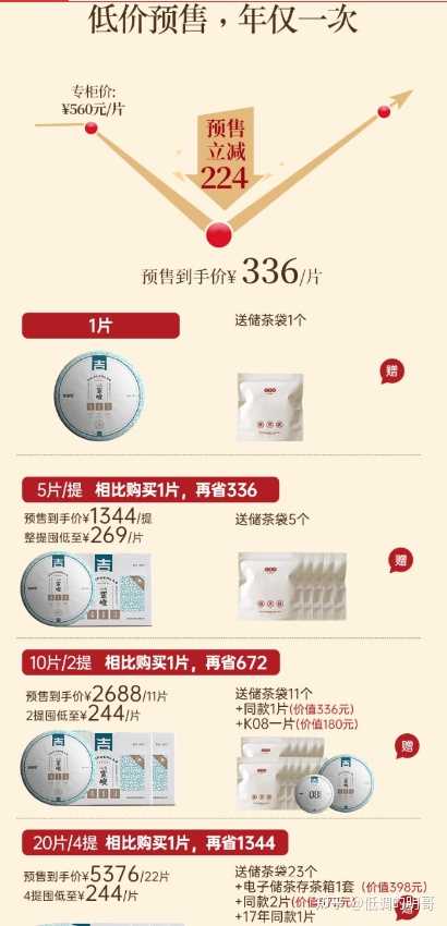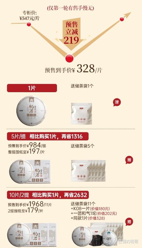 春茶季期間,本品價格由日常的500多降至328元/片,一提購買單片低至197元/片,2提購買則單片低至179元/片且加送K08一篇,一團和氣1托,及同款1片,建議自飲考慮1提,如有送禮需求不妨考慮2提,最優性價比