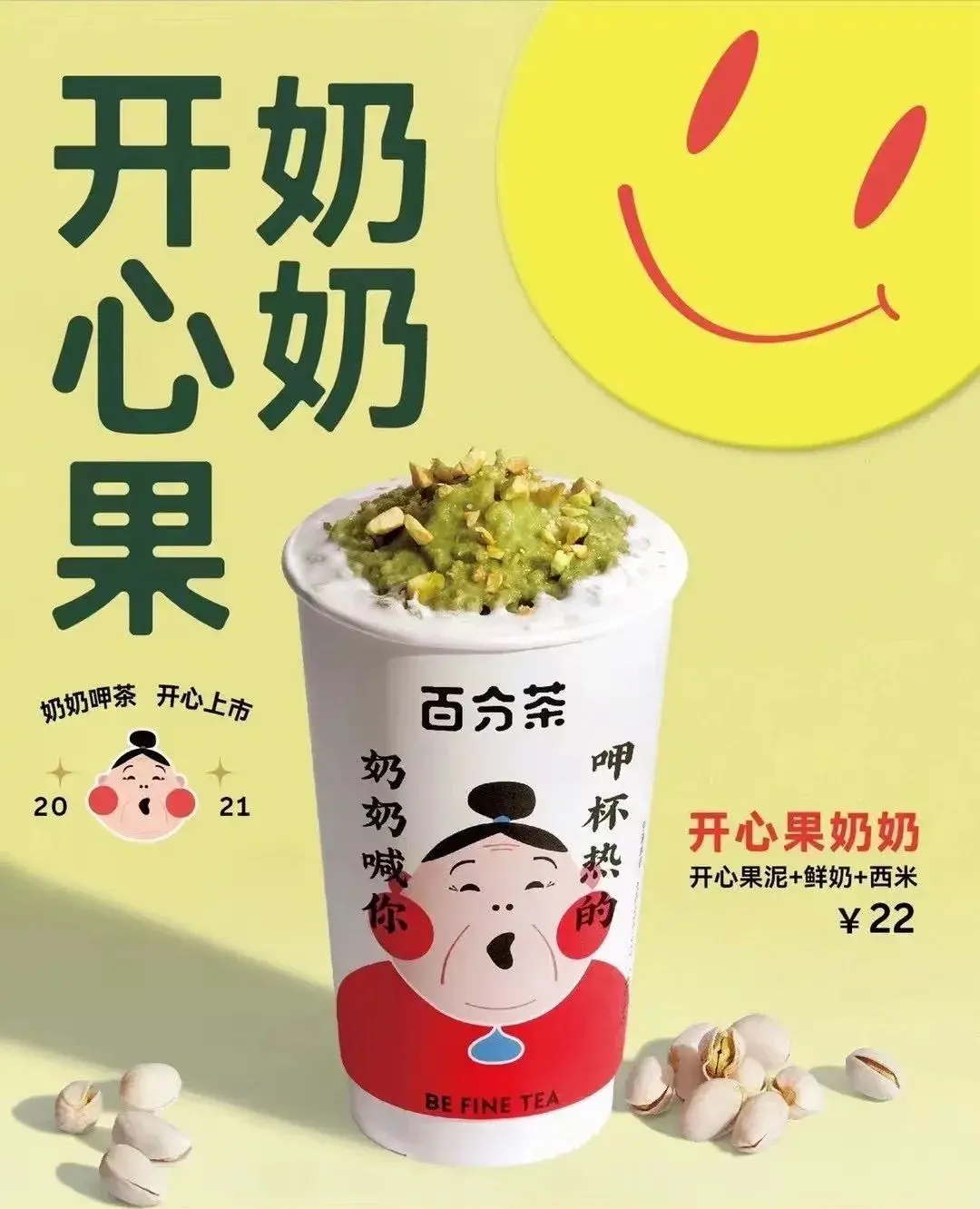 “開心果奶奶”是百分茶在本月初于全國門店上新的產品,將開心果果碎、果泥、鮮奶、小圓子、文山青茶相融合。