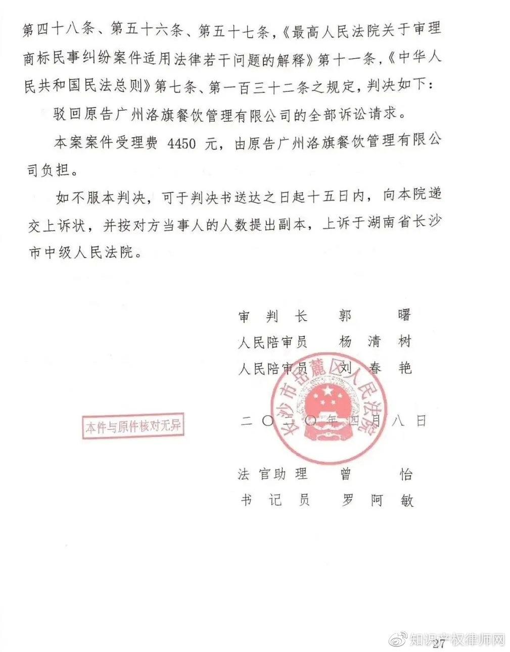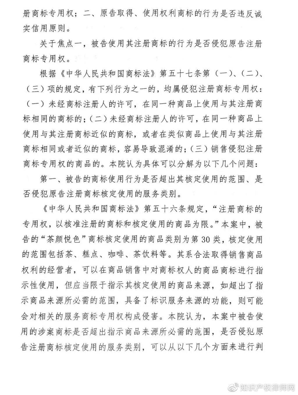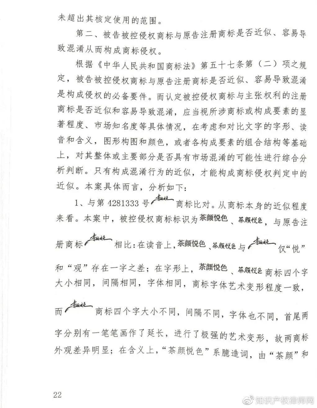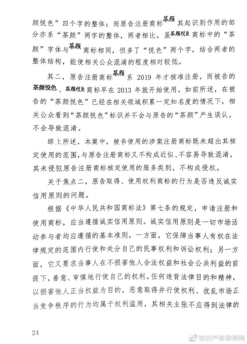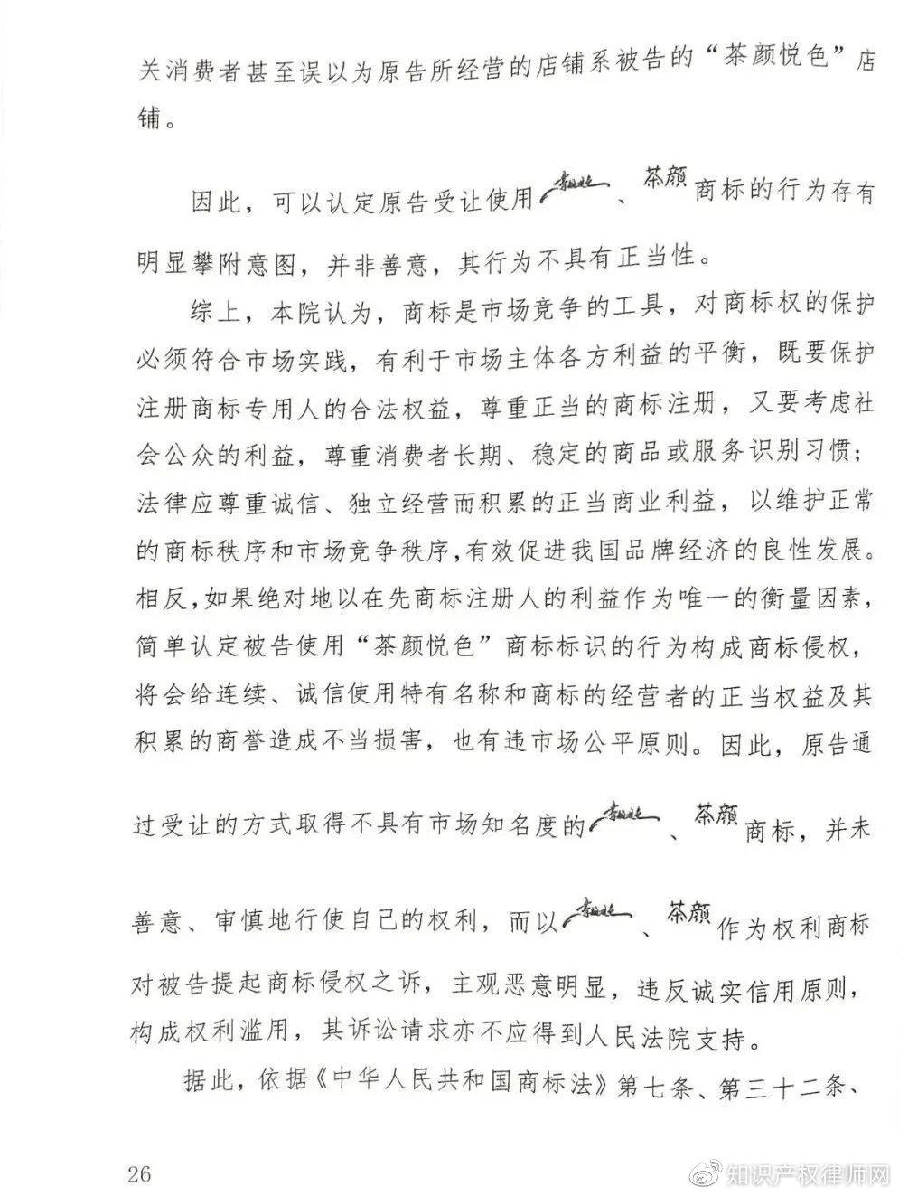 法院判決“茶顏悅色”不構成侵權;洛旗公司作為同行業競爭者,理應知曉“茶顏悅色”的知名度,但其仍受讓使用注冊商標“茶顏觀色”,并以此作為權利商標對注冊商標“茶顏悅色”提起商標侵權之訴,主觀惡意明顯,違反誠實信用原則,故洛旗公司訴訟請求不應得到法院支持。