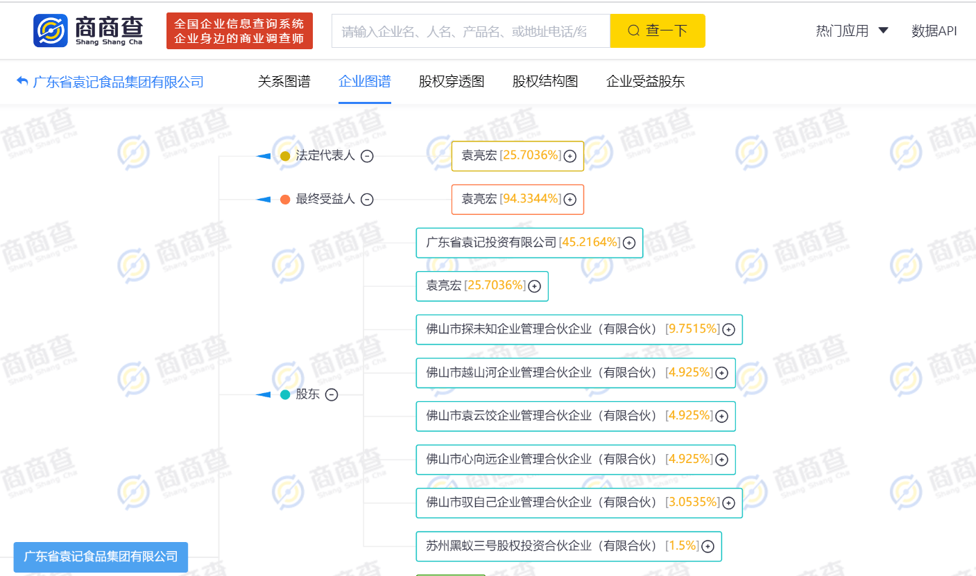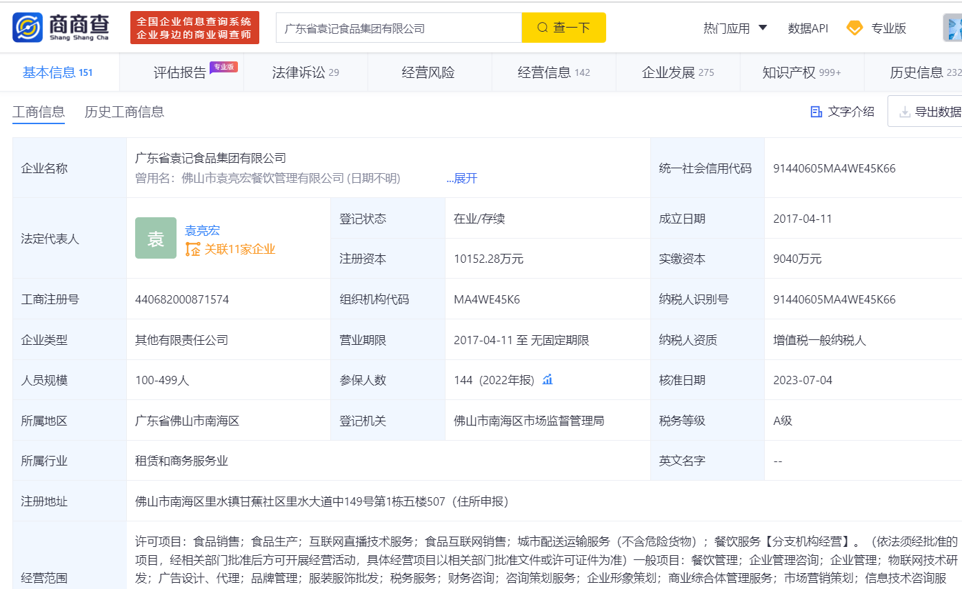 【商商查】APP顯示,袁記云餃隸屬于“廣東省袁記食品集團有限公司”旗下品牌,公司曾用名為佛山市袁亮宏餐飲管理有限公司,成立于 2017 年,法定代表人和最終受益人為袁亮宏。