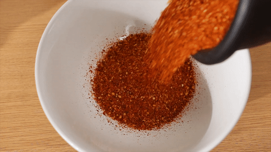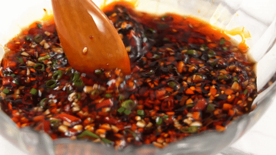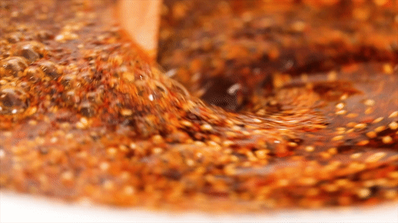用大湯勺舀一勺熱油倒入辣椒粉中,并用筷子攪拌,繼續再倒熱油,再攪拌,直至混合均勻。