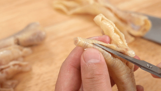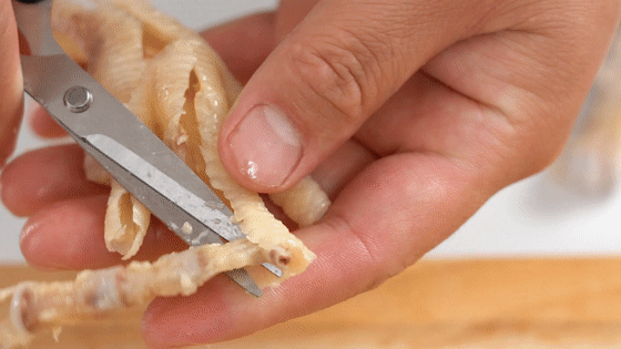 用剪刀在爪背的每個腳趾方向劃開(要劃到骨頭,不能太淺)。接下來處理腳趾骨。用廚房剪刀貼著腳趾骨剪開。