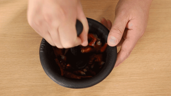 炒好的辣椒倒入鑄鐵搗碎器中,搗碎成粗顆粒狀,不要太細,辣椒油更香且淋油的時候不容易糊。(如果家中有破壁機,研磨機的就直接用機器,效果一樣,且更省事,中途記得開蓋觀察狀態,不要打的太碎。)