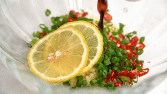碗中加入檸檬2片、小米椒圈適量、蒜末適量、蔥段適量、生抽3大勺、香油1小勺、醋2大勺。