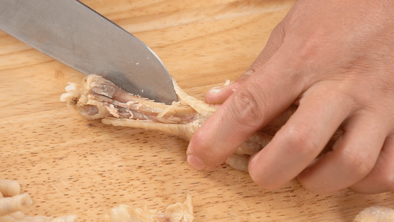 用刀將主干骨與皮肉分離,連腳趾處有筋,也要切斷。然后扭動,輕松拔出最粗的那根骨頭。