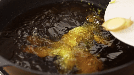 炸約2到3分鐘,蔥白炸至金黃色關火,然后用濾網撈出丟棄。