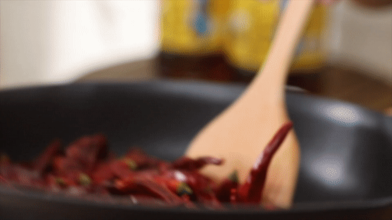 炒鍋無水無油燒熱,將三種辣椒一起倒入鍋中,小火翻炒,大概20分鐘左右,辣椒中水分蒸發,辣椒變得更硬更脆。(一定要用小火,并且用鍋鏟不斷翻炒,不然很容易變黑,大面積發黑的辣椒不要使用了,辣椒一次炒不完,可以分幾鍋炒制。)