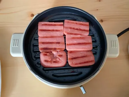第十一步:火鍋的煎盤也不要閑著,可以把午餐肉煎至兩面金黃食用。