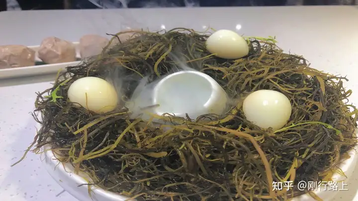 形似鳥窩的擺盤,以為主角是鵪鶉蛋,其實主角是“草”,這草是海發菜,糟粕醋的“黃金搭檔”,有糟粕醋的地方肯定會有它。這是一種很難得的珍貴蔬菜,是一種野生的天然深海植物。吃起來口感細嫩清脆,潤滑爽口,但是有些人卻不愛吃,而我就是“有些人”的其中之一。