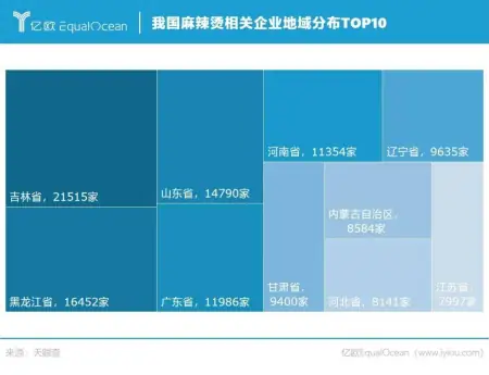 天眼查數據顯示,目前我國有超17.3萬家麻辣燙相關企業,從地區分布來看,吉林省和黑龍江省分別以約2.2萬家和1.6萬家的數量位居前二。楊國福和張亮的發起地、被稱為“麻辣燙之鄉”的哈爾濱賓縣,共有超330家麻辣燙相關企業。