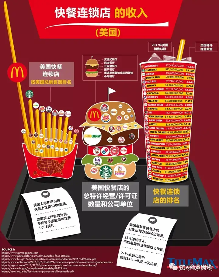 2017年,美國前30大快餐連鎖店的銷售額達到1720億美元,超過14萬家店。如果算上規模較小的連鎖店,該行業的年收入將高達2000億美元。
