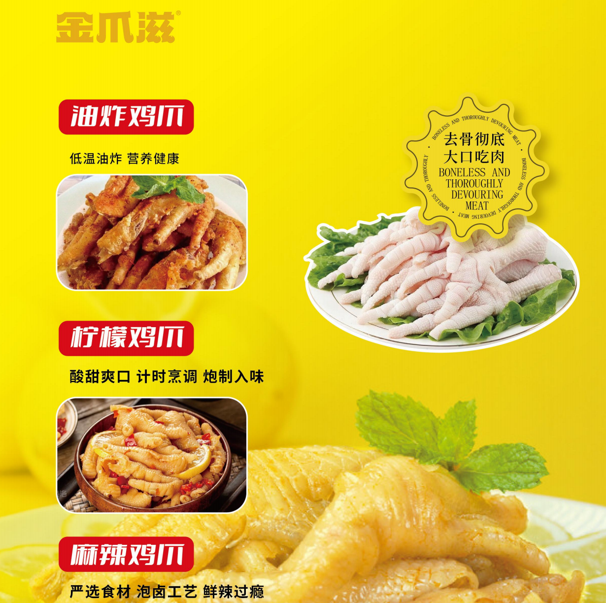 金爪滋食品在“低調、務實、下沉、利他”的企業文化指導下,秉承“誠信、質量、服務、創新”的經營理念,嚴格遵守食品安全管理規范,創新產品生產工藝,為客戶提供更安全、更健康、更美味的食品。金爪滋以打造行業綠色龍頭企業及爪類食材優秀供應商為目標,堅持在產品力、渠道力和品牌力上深挖潛力,致力于成為中國爪類食品的領導品牌。