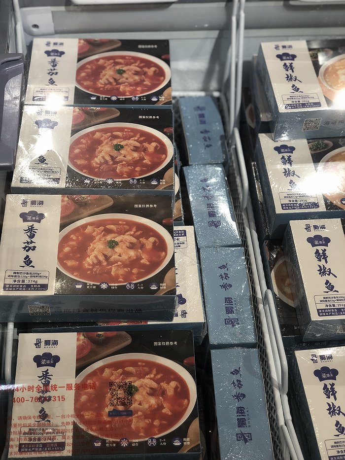 從產品上看,這里包含了大多數你能在海底撈吃到的產品,SKU大概在100個左右。包括牛羊肉卷、菌菇、蔬菜、魚丸、油條、豆制品、拉面等食材,火鍋外賣所需的底料和醬料,海底撈啤酒在內的飲品,半成品的魚香肉絲、酸湯肥牛、番茄魚、鮮椒魚等菜品,自熱火鍋,速食粉絲,以及牛羊肉串等燒烤食材。