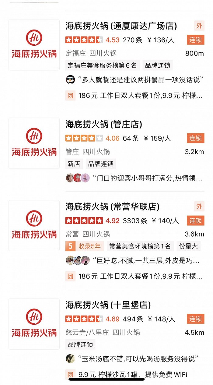 不過對于海底撈來說,專門開自提站的商業模式是否有效,還有待進一步驗證。因為從首家門店的業務覆蓋范圍來看,自提站的業務范圍與其原有的外賣市場重合度極高,比起堂食,線下門店的商品也并沒有價格上的優勢。大眾點評顯示,在這家自提站附近的5公里范圍內,就有4家海底撈門店。