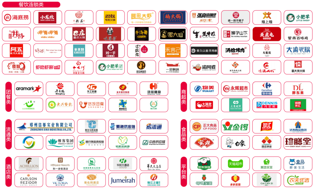 底料調味料:火鍋底料、蘸料、豆瓣醬、骨湯清湯、油脂麻醬、辣椒油、花椒油、沙茶醬、日本味鹽、魚生醬油 、燒烤相關調味品等特色食材涮品:牛羊肉、毛肚、百葉、黃喉、鴨鵝腸、鴨血鴨掌、粉絲粉條、時令蔬菜、菌菇食材、丸子、蝦滑魚滑、火鍋面、豆制品等海鮮食材:龍蝦仔、向螺片、蟹腳、生蠔、生海蝦、大生魚片、鮮魷魚、鯇魚腩、大花蟹、鮑魚、養顏花膠、鮮貝、水發海參等丸滑制品:芝士雞肉丸、鵝肝丸、麻辣鮮牛丸、水晶蝦丸、墨魚滑、蝦滑魚滑、鯪魚滑、手打鮮魚丸、手打鮮雞丸、潮州魚旦、粗牛根丸等凍品食材:水產魚蝦、水果蔬菜、乳制品、肉禽蛋類、丸滑制品、水餃湯圓、烤燒食材等調理類食材:冷凍禽肉類調理制品、速凍米面制品、裹面制品、魚糜制品、菜肴制品、燒烤制品、果蔬制品、火鍋湯料制品、湯羹制品、燒烤調理食材等餐具與設備用品:洗碗機、調湯機、火鍋桌椅、電磁爐、餐廚垃圾處理設備、牛羊肉切片機、絞肉機、包裝設備、速凍設備、保鮮柜、燒烤用品等配套設備休閑(小吃)食品:香辣小魚皮、小麻花、年糕、薯條、紅糖糍粑、糯米鍋巴、麻辣豆皮等酒水飲品:酒精類飲品(白酒、黃酒、啤酒等)、果汁果醬、茶飲、咖啡、碳酸飲料、奶茶、現調飲品、甜品及速溶飲品等配套服務:火鍋燒烤店裝修服務、收銀終端、送菜機器人、智能配菜機器人、服飾工裝等軟裝與家具:火鍋專用器皿、廚房設備不銹鋼廚具、火鍋桌椅、醬料臺、備餐柜、卡座沙發、燈具等外賣餐具及用品:外賣包裝袋、包裝盒、打包盒、飲品瓶子、密封袋等
