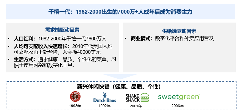 到2000到2020年左右,需求端數量龐大的千禧一代紛紛成年,約有7600萬人開始獨立消費,對餐飲業產生了顯著的需求。