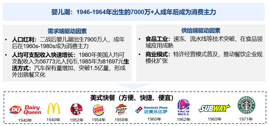 美國當今眾多的知名快餐品牌均在60年代到80年代,充分享受了供需兩端發展帶來的時代紅利,快速發展。