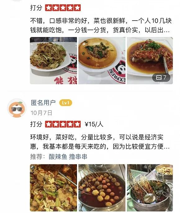 根據目前的評論情況看,這家餐廳的人均價格在20元以下。從營業時間10:00-22:30判斷,熊貓餐廳不僅提供正餐,可能還有早餐和夜宵,菜品有粥、豆漿、油條、米線、包子、酸菜魚等,菜單上當然少不了熊貓快餐在美國市場大受歡迎的招牌菜宮保雞丁和陳皮雞,以及更有中國本土特色的擼串串和張飛牛肉。