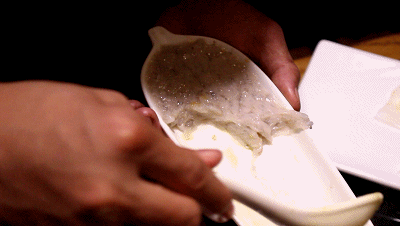 一盤蝦滑變成小球一個個滾入熱鍋