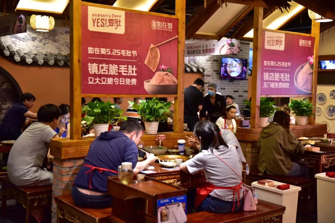5月25日,在成都如在蜀毛肚火鍋店門口,一大早就開始排起了長隊。當天,是如在蜀毛肚老火鍋開業兩周年的日子,同時推出了毛肚節,當天到店的顧客可以免費不限量吃如在蜀的招牌鋪蓋毛肚。活動當天,許多消費者從早上開門就開始排隊,不到11點,玉林店、春熙店就已經排隊40多桌,每桌毛肚都按斤上。據不完全統計,當天如在蜀兩家直營門店共排號1586桌,總計接待1302位客人,吃掉1900多斤毛肚,也就是說,平均每人吃掉了3份毛肚,平均每分鐘有70片毛肚被涮燙。