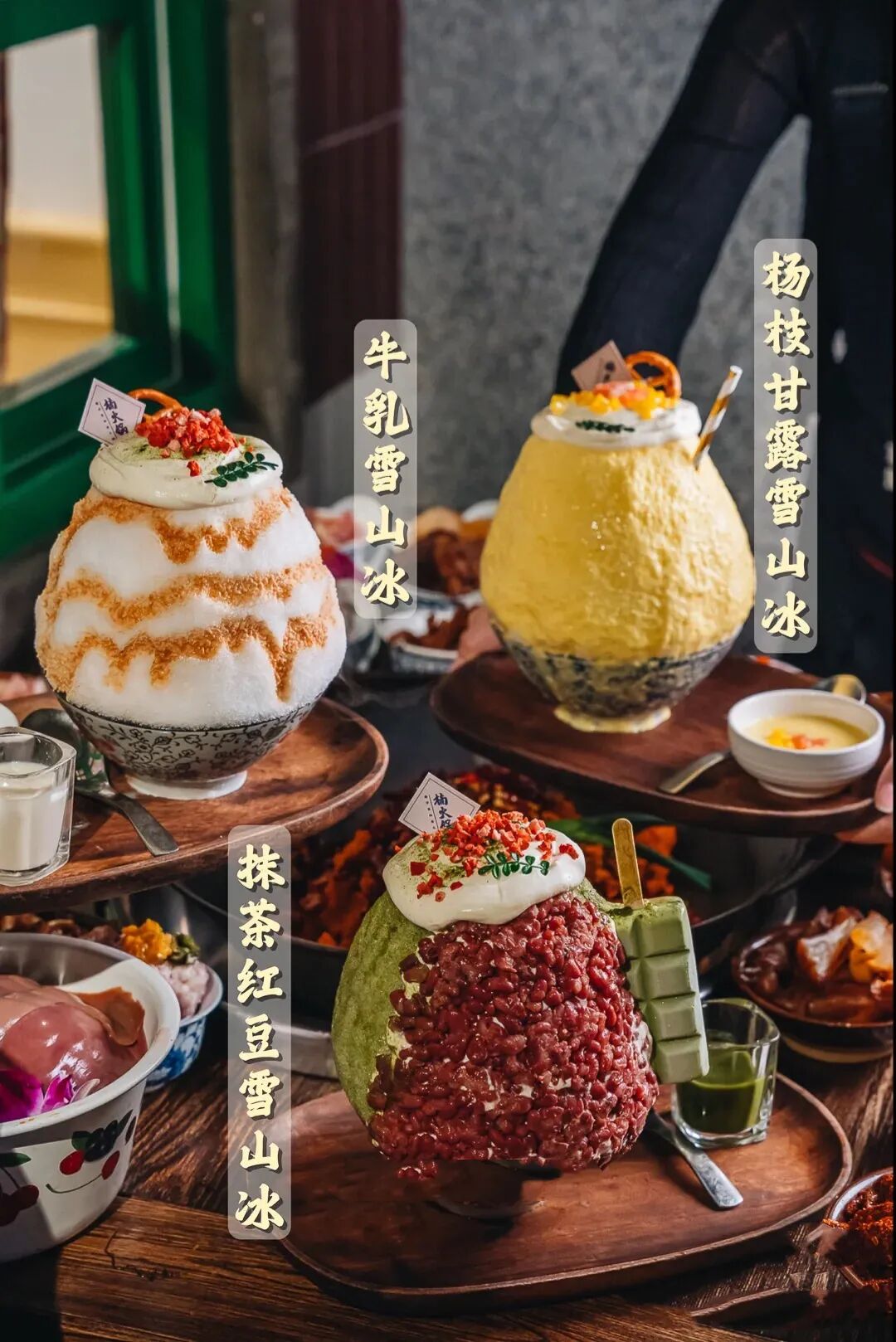 青提雪山冰、芒果芝士牛乳冰、紅絲絨夢龍雪冰