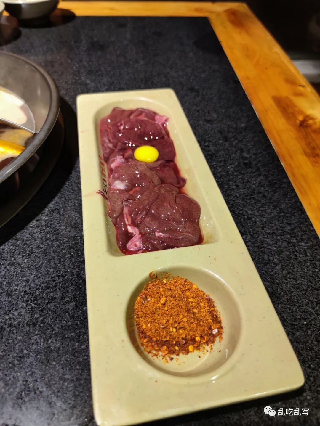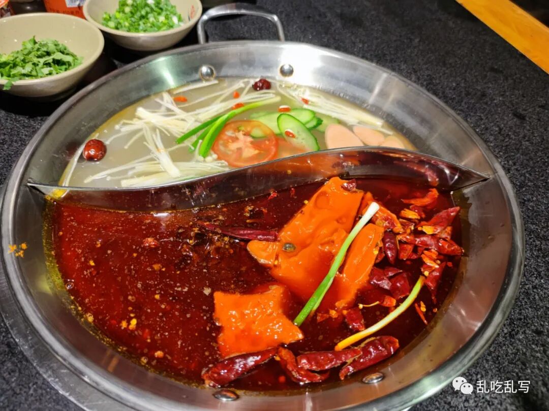 先來說說這個鍋底,主要說紅鍋的部分,點鴛鴦鍋是因為有綠葉素菜,煮紅鍋太油,煮白鍋是比較合適的。如果在重慶,大部分火鍋店沒有鴛鴦鍋這個選項的,重慶某火鍋店的廣告語就把這個現象體現得淋漓盡致:微辣已是最后妥協。