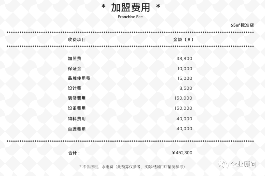 塔斯汀:加盟費是38800,按65平的一個門店來規劃的話,不包含租金和轉讓費。公司給大家預估出來的預算會在452300元左右。