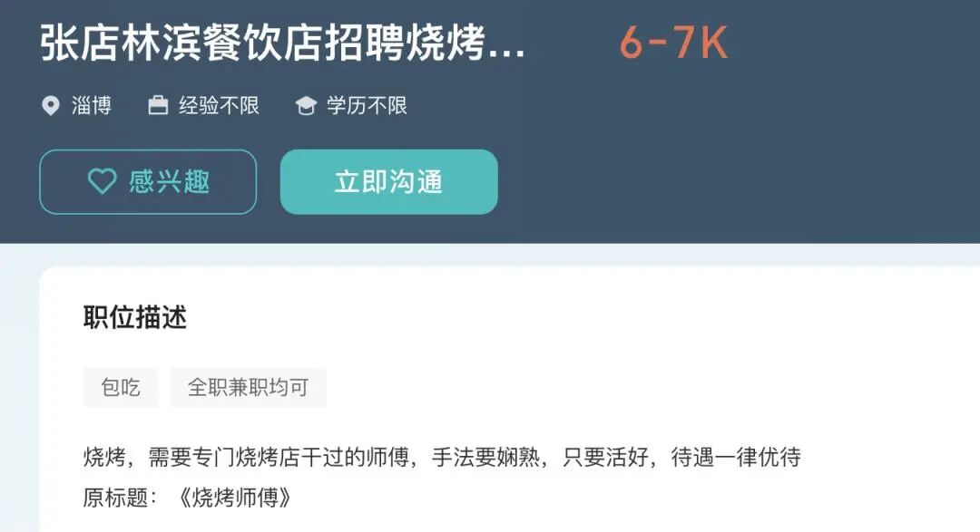 有人去招牌網站搜索淄博燒烤師傅相關招聘,發現當下淄博燒烤師傅的工資已經漲到了七千元,差不多可與一線城市廚師媲美。