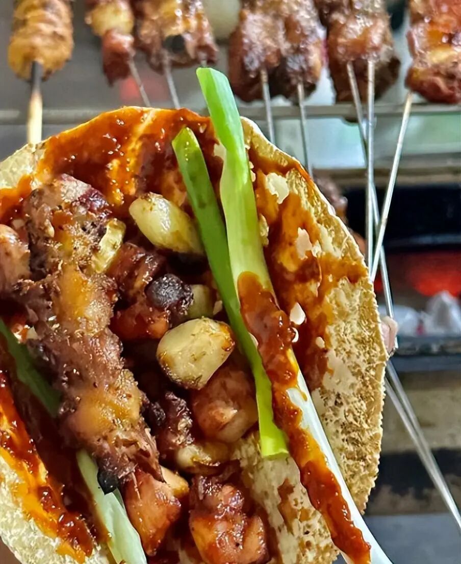大家一起圍在燒烤小火爐旁,掌心攤上面餅,將烤熟的肉串一把攥下,再配上青白脆嫩的山東大蔥,至此,一道美味十足的淄博燒烤就完成了。