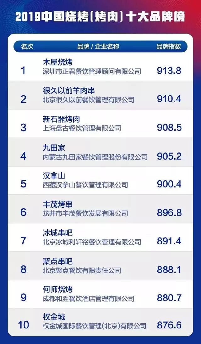 從“2019年餐飲營銷力峰會”評選的“2019年中國燒烤(烤肉)十大品牌榜”入選品牌也可窺見一二。