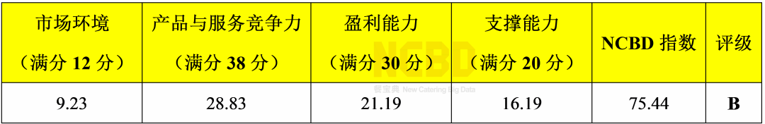 NCBD指數和評級:75.44分,B級。測評結果為良好,可以加盟,需要做好評估。