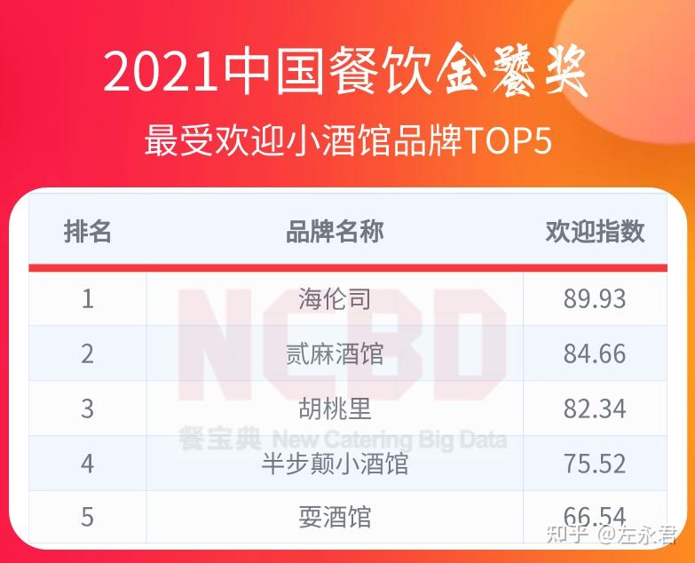 21、最受歡迎小酒館品牌TOP5(以下16個品類榜單,因知名且有影響力的品牌較少,故只評選前五名):海倫司,貳麻酒館,胡桃里,半步顛小酒館,耍酒館。