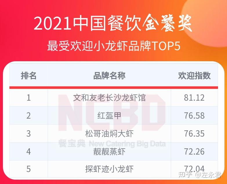 22、最受歡迎小龍蝦品牌TOP5:文和友老長沙龍蝦館,紅盔甲,松哥油燜大蝦,靚靚蒸蝦,探蝦跡小龍蝦。