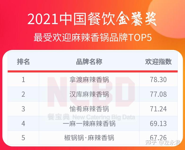 31、最受歡迎麻辣香鍋品牌TOP5:拿渡麻辣香鍋,漢庫麻辣香鍋,愉肴麻辣香鍋,一麻一辣麻辣香鍋,椒鍋鍋·麻辣香鍋。
