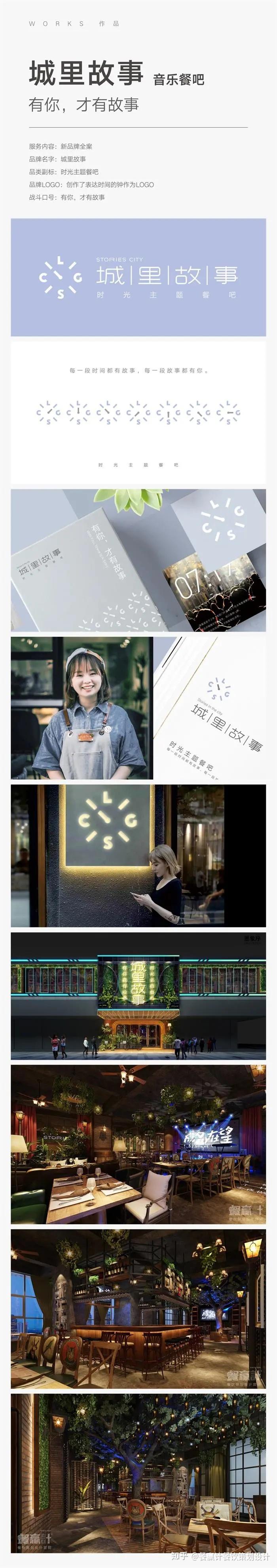 【面子工程亮點】城里故事是用美食、飲品、音樂等元素與個性文化相結合的音樂休閑餐吧。品牌文案策劃了諸多走心故事和情感文宣;“時光”是品牌視覺設計的核心。將名稱的拼音首字母“CLGS”藝術化設計為時鐘狀圖形,設計時采用筆畫纖細、兼備曲直的字體,營造簡潔、文藝印象和氣質,與時光主題音樂餐吧講情調的屬性相符;大量延展到品牌物料應用,加深消費者記憶;色調選擇別致典雅的淡紫色和淺灰色,避免喧囂浮躁;空間設計使用大量的綠植、燈光和落地玻璃,增加門店在室外的感覺,燈光透過綠植照射在空間里,點點斑駁,情調氛圍很好;內部設計混搭,喚醒消費者內心的感性思緒。城里故事從面子工程上,將品牌門店打造成一位內斂、文靜、優雅的網紅博主,和顧客靜默分享著每一天的喜怒哀樂,滿足了年輕人對餐飲、音樂、情感的所有向往。