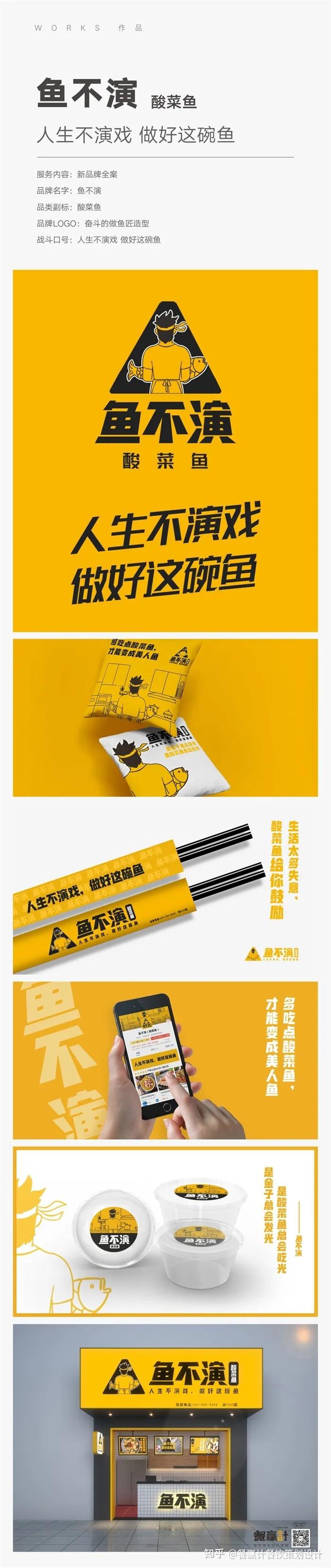 【面子工程亮點】在前期與甲方的溝通中了解到,項目創始人現已年過40,從事廚藝近20年,擅長做各種口味的魚,他本人從來沒有離開過廚師行業,餐贏計以此為靈感,一舉敲定了品牌命名:魚不演,并由此創作了品牌戰斗口號——人生不演戲,做好這碗魚!品牌名稱設計成粗壯的專屬字體,圖形LOGO創意成穩健的三角形結構(也是舞臺聚光燈的造型),都體現了品牌厚重踏實的風格;因為是純外賣互聯網餐飲品牌,核心消費群體是年輕上班族,所以品牌文案采用有趣調侃的表現方式,品牌主色采用新潮的黃黑色,LOGO圖形中人物奮斗的造型也是年輕人喜歡的手法。隨著年輕上班族越來越習慣于通過美團、餓了么等外賣平臺解決就餐問題,純互聯網外賣品牌的魚不演也將迎來品牌發展良機。