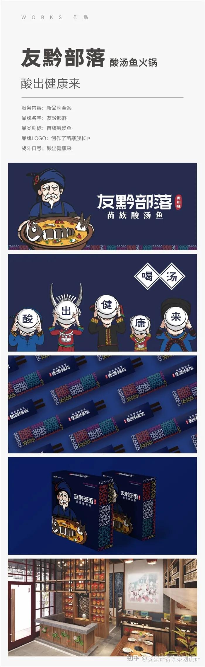 【面子工程亮點】黔,代表貴州,苗寨部落人熱情好客,構思品牌名稱“友黔部落”,巧妙將酸湯魚的起源地融入到名稱中。我們從“酸”字上挖掘產品賣點,創作了“酸出健康來”的口號和系列關于“酸”和“健康”的信任狀。在VI視覺傳達上,我們提煉代表苗族的色彩和花紋,彰顯少數民族風情;挖掘地域文化源頭,創作了系列苗族苗寨人物加大碗喝湯的形象。空間則選用新中式加民族風情的設計風格,從空間視覺和文化等導入發源地的文化母體。