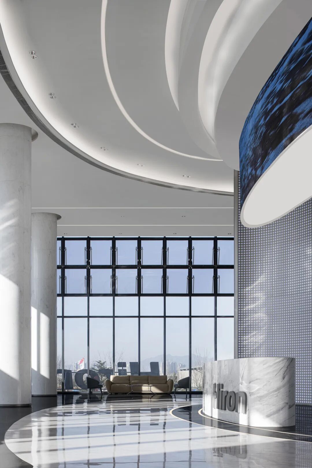 二層大堂作為企業形象的展示窗口和整個研發中心公共屬性最強的樓層,基于雙層挑空和橫向構圖的結構預留現實,集米設計采用聚焦中心的設計策略,將設計的重點聚焦在前臺區域。將海浪的自然形態作為形式操作的手段,轉化為空間中抽象的線條、形式和紋理,創造出具有獨特辨識度的大堂空間。與前臺造型相呼應的吊頂,從上至下體量逐漸遞減,從而收縮畫面視覺,強調空間的中心并劃分功能邊界。背景整體采用背發光沖孔鋼板,結合流暢線條的頂面燈槽、地面線燈和吊頂燈膜,使大堂空間照明柔和均勻。背景板也是空間中重要的裝飾展示面,不銹鋼世界地圖懸浮于沖孔鋼板上方,通過紅色透光亞克力標記首都和省會展示企業的發展宏圖。