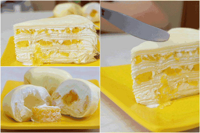 榴蓮正當時!泰國金枕榴蓮搭配現煎餅皮,QQ彈彈的餅皮夾著一層混著奶香的榴蓮餡與戚風蛋糕胚結合