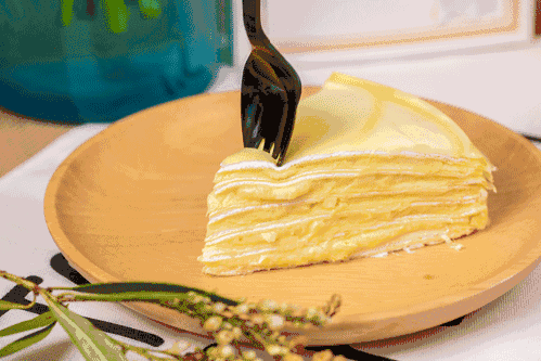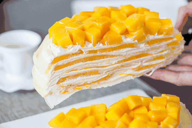 手工Q彈千層餅皮 ,始終采用越南當季成熟芒果,飽滿多汁,清香四溢,手工煎制蛋皮、戚風蛋糕胚與新鮮水果的浪漫相遇,酸甜怡人