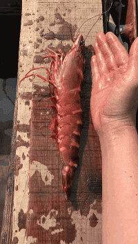 這是臺灣海峽產的深海斑節蝦,斑節蝦的蝦青素含量比其它蝦類高20%-30%,是返老還童的美容珍品,深得女士歡心。