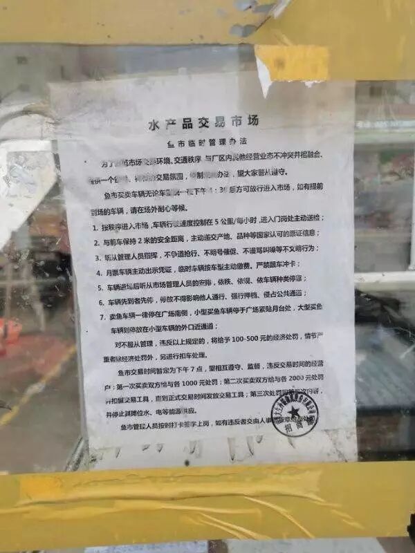 記者發現,下午5點多鐘,大生冷鏈公司兩棟建筑中間的空地上,果然熱鬧了起來,經營戶們拖著大塑料筐進場了,里面裝有各類鮮活的水產品。記者看見,在這個水產市場中間的一個白色小亭子里,貼有大生冷鏈公司招商部印發的《水產品交易市場魚市臨時管理辦法》。