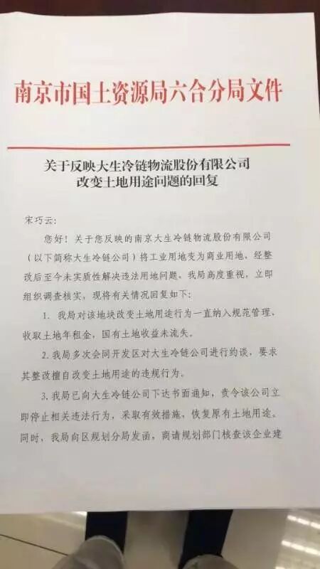 記者隨后查看到了南京市國土資源局六合分局于2018年11月28日印發的《關于反映大生冷鏈物流股份有限公司改變土地用途問題的回復》,對大生冷鏈公司將工業用地變為商業用地的行為明確定性為違法用地,并要求其立即停止違法用地行為,恢復原有土地用途。