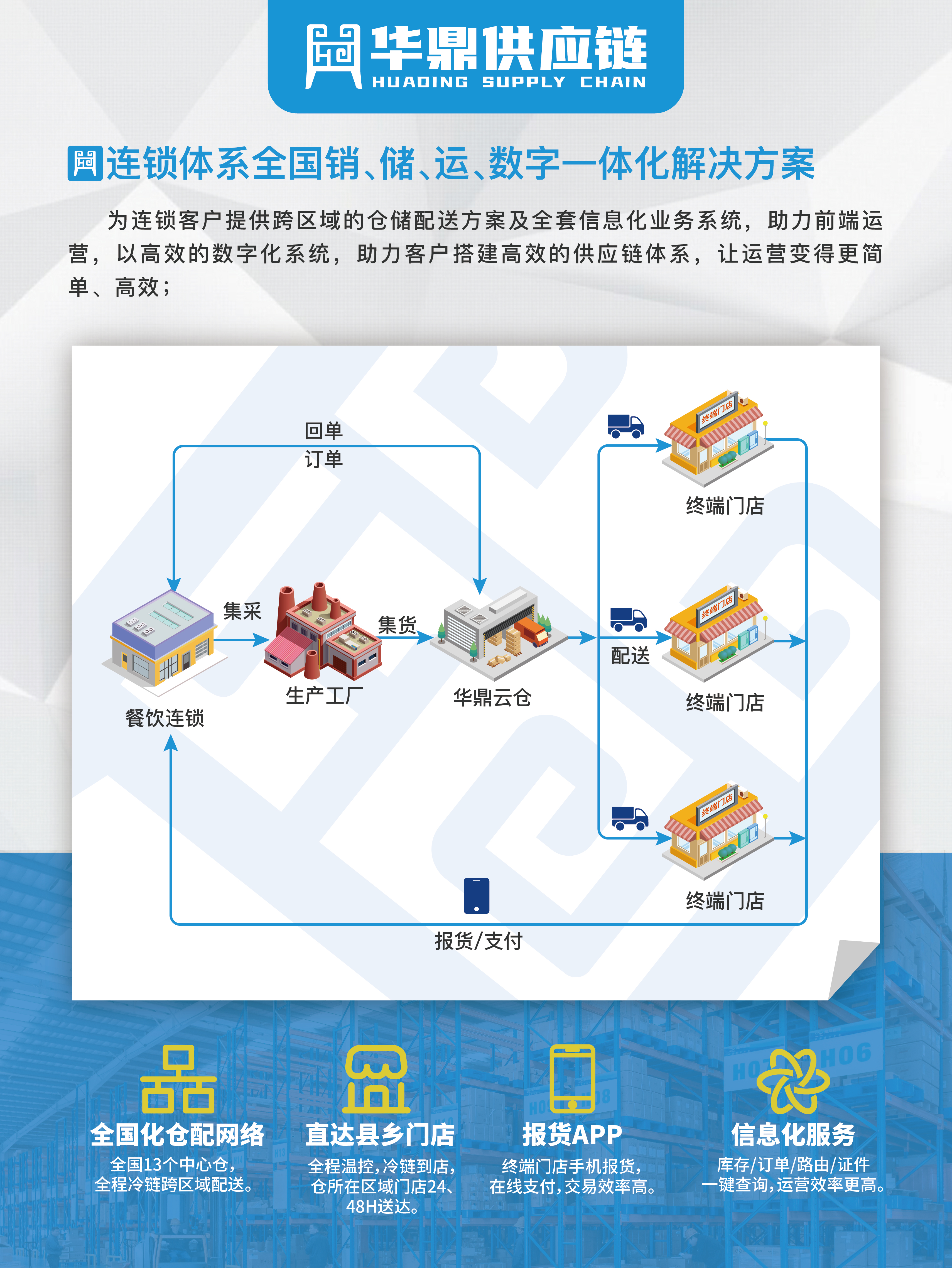華鼎冷鏈是一家專注于為餐飲連鎖品牌、工廠商貿客戶提供專業高效的冷鏈物流服務企業,已經打造成集冷鏈倉儲、冷鏈零擔、冷鏈到店、信息化服務、金融為一體的全國化食品凍品餐飲火鍋食材供應鏈冷鏈物流服務平臺。