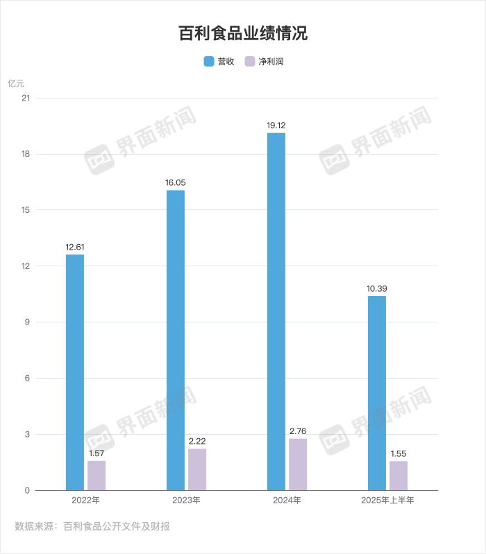 2022年至2024年,百利食品營收分別達到12.61億元、16.05億元和19.12億元;同期歸母凈利潤分別為1.57億元、2.22億元和2.76億元。在2025年上半年,這家公司的營收達到10.39億元,歸母凈利潤為1.55億元。